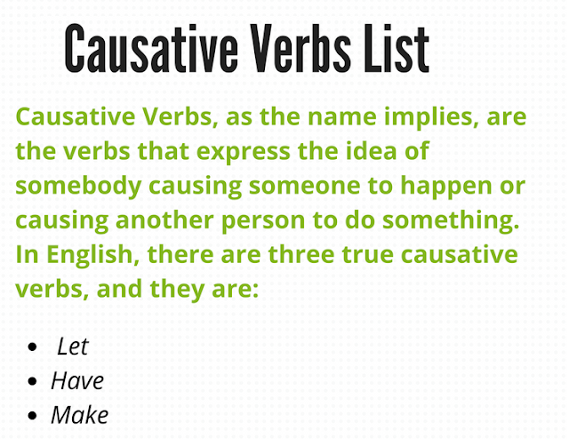 Causative Verbs, as the name implies, are the verbs that express the idea of somebody causing someone to happen or causing another person to do something. In English, there are three true causative verbs, and they are: