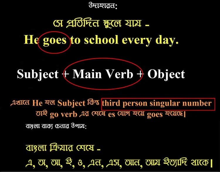 গঠন প্রণালি: Subject-এর পর মূল verb-এর present form ব্যবহূত হয়। তবে subject (কর্তা) third person singular number হলে মূল verb-এর শেষে s বা es যোগ করতে হয়।